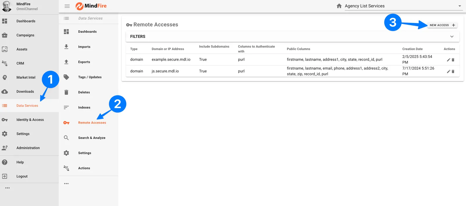 - Navigate to Data Services > Remote Access in your MindFire dashboard