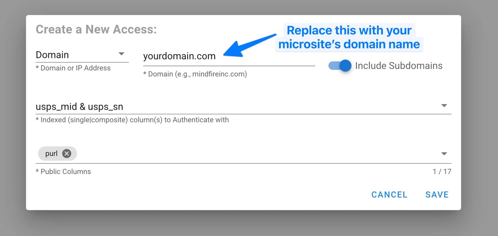 usps_mid&usps_sncomposite index you created in Step 1 - Select PURL as the public column that will be accessible
